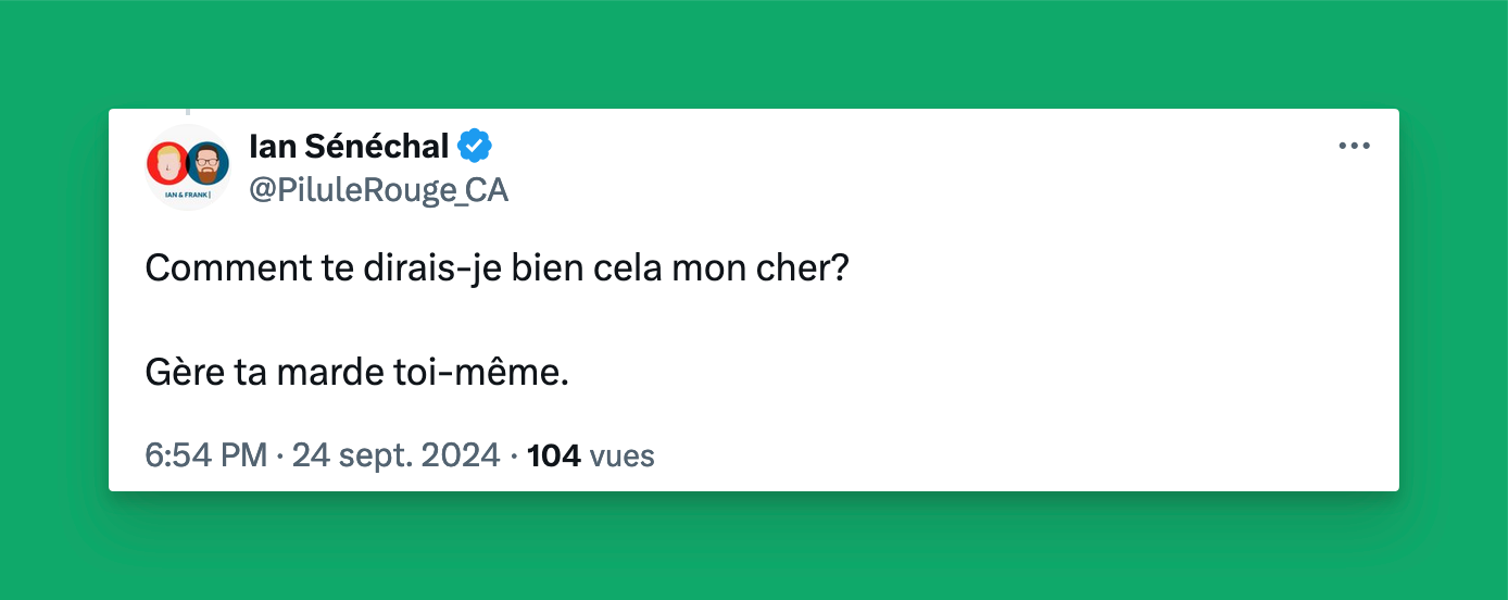 J’ai ensuite interpellé le propriétaire du compte YouTube, Ian Senéchal, pour qu’il explique à M. Caron que la diffusion de cette fausse information pourrait nuire à sa réputation de chercheur distingué. Mais M. Sénéchal a choisi de m’envoyer chier.