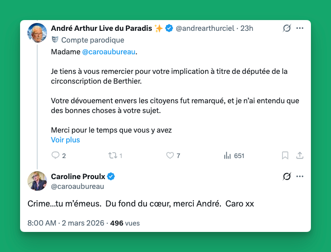 Ça me fait tiquer parce que deux jours avant, Mme Proulx encourageait l’un des trolls les plus agressifs des réseaux sociaux. Le compte André Arthur au paradis sur X, géré par quelqu’un qui a pris la relève d’André Arthur après sa mort, qui est vraiment misogyne, homophobe, agressif. Il relaie aussi la désinformation russe, entre autres.