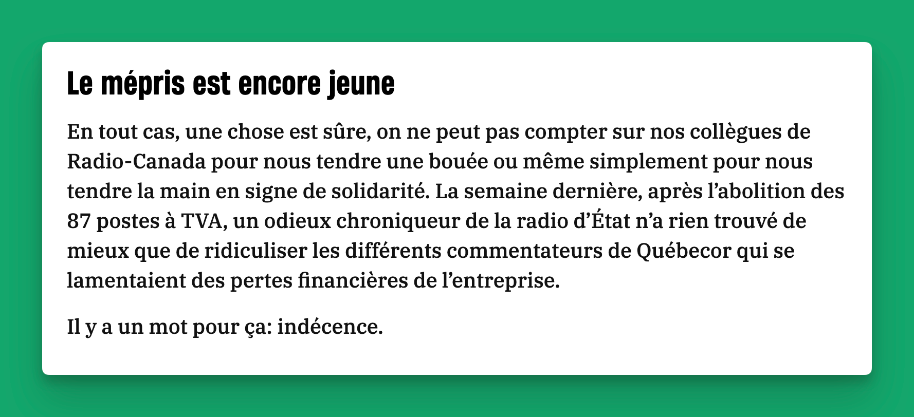La semaine dernière, j’ai fait une chronique à la radio où il était question d’animateurs de Québécor qui se plaignaient que Radio-Canada ait 20-30-40 recherchistes pour une émission. La surenchère me faisait rire. J’ai aussi parlé des coupes à TVA qui sont une terrible nouvelle pour les médias et particulièrement pour l’information locale. Bien sûr, j’ai fait quelques petites blagues autour de ça, mais personne n’a pu penser que je me moquais des médias privés en détresse. En tout cas, c’est ce que je croyais avant de voir ce tweet de Pierre Pagé.