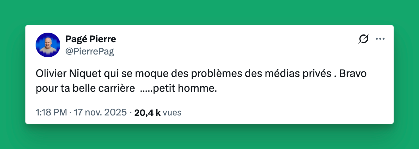 La semaine dernière, j’ai fait une chronique à la radio où il était question d’animateurs de Québécor qui se plaignaient que Radio-Canada ait 20-30-40 recherchistes pour une émission. La surenchère me faisait rire. J’ai aussi parlé des coupes à TVA qui sont une terrible nouvelle pour les médias et particulièrement pour l’information locale. Bien sûr, j’ai fait quelques petites blagues autour de ça, mais personne n’a pu penser que je me moquais des médias privés en détresse. En tout cas, c’est ce que je croyais avant de voir ce tweet de Pierre Pagé.