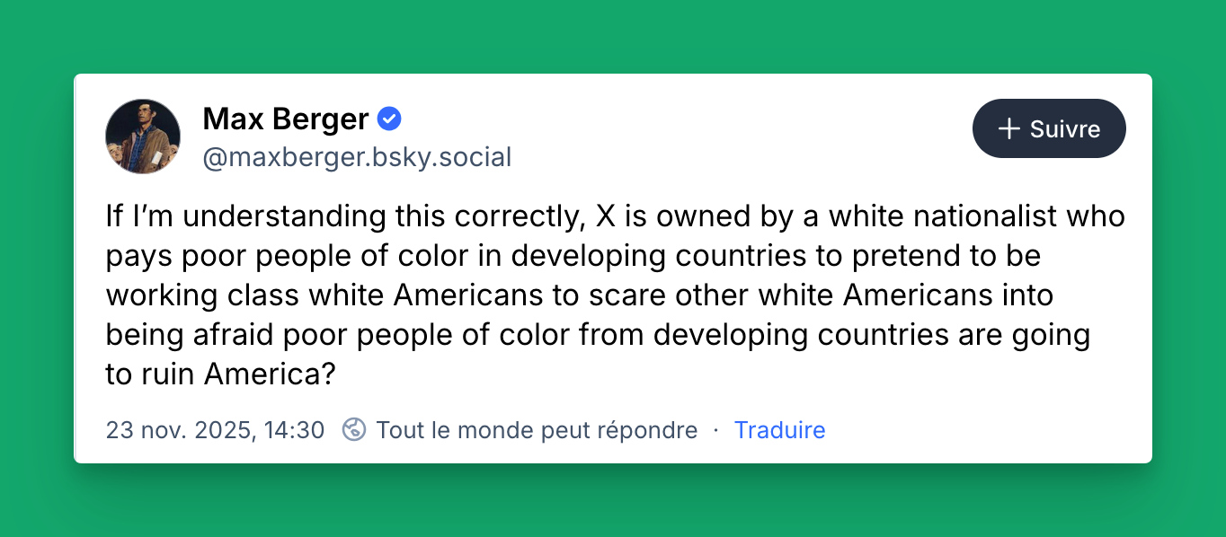 Il y a quelques jours, la plateforme X a ajouté la géolocalisation des profils de ses utilisateurs. On a ainsi découvert que plusieurs comptes états-uniens qui vantaient Trump et sa secte MAGA étaient en fait basés à l’étranger. Par exemple, « le compte MAGANationX — avec près de 400 000 abonnés et une biographie indiquant « La voix patriote pour Nous le Peuple » — est en réalité basé en Europe de l'Est. » Il y a aussi « un compte de fans d'Ivanka Trump, IvankaNews, qui compte 1 million d'abonnés et publie fréquemment sur les dangers de l'Islam, la menace de l'immigration illégale et le soutien à Trump. » Ce compte est basé au Nigeria.