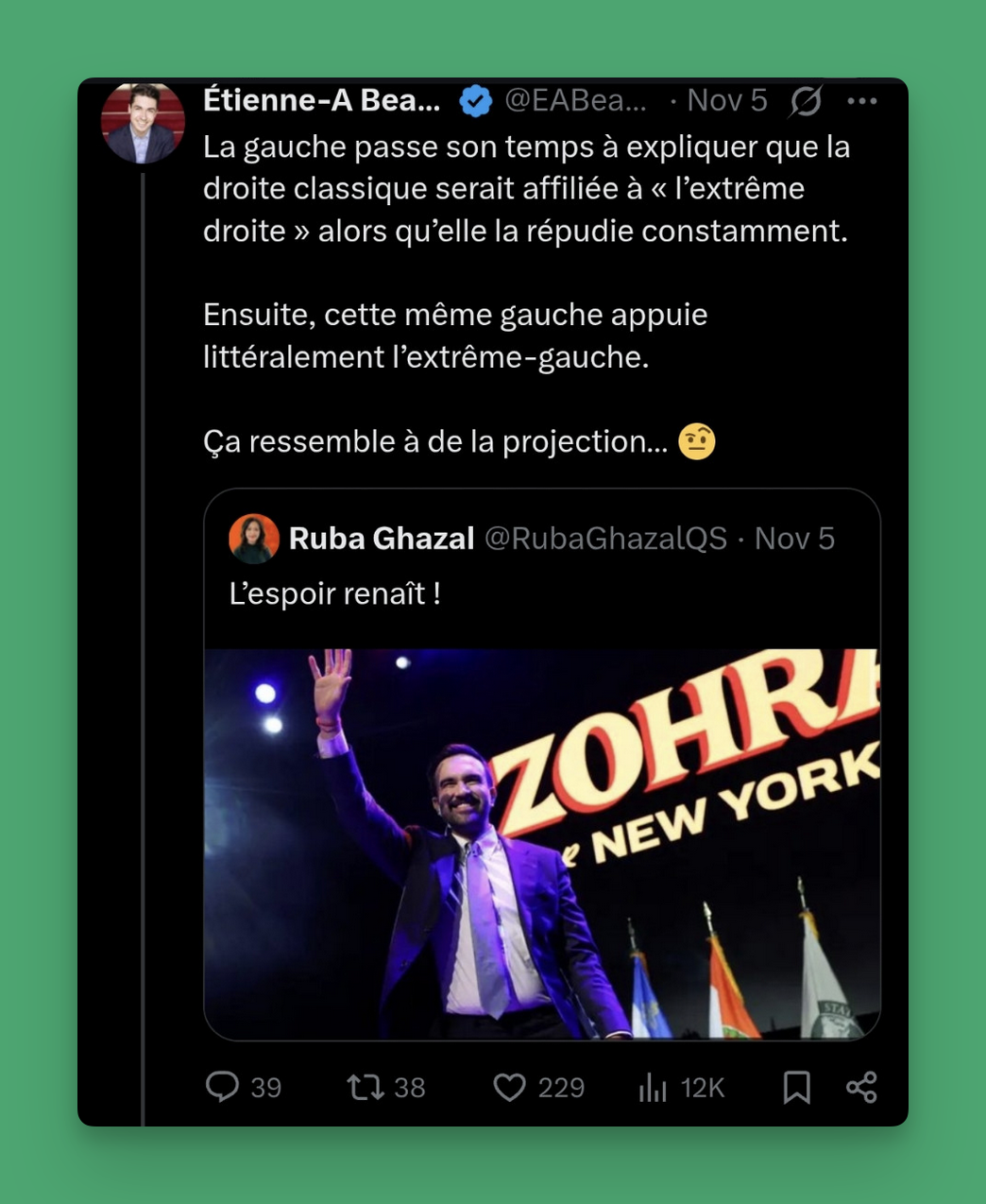J’ai aussi vu Normand Baillargeon aller au podcast de Jerr Alain. C’est triste. Quant au nouveau jeune conservateur préféré de Mathieu Bock-Côté, Étienne-Alexandre Beauregard, il est allé chez la complotiste saucée Éloïse Boies. Il a aussi visité Jeff Fillion. C’est drôle parce que quelques jours plus tôt, il avait écrit ceci sur X: