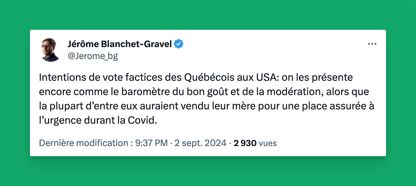 Intentions de vote factices des Québécois aux USA: on les présente encore comme le baromètre du bon goût et de la modération, alors que la plupart d’entre eux auraient vendu leur mère pour une place assurée à l’urgence durant la Covid.