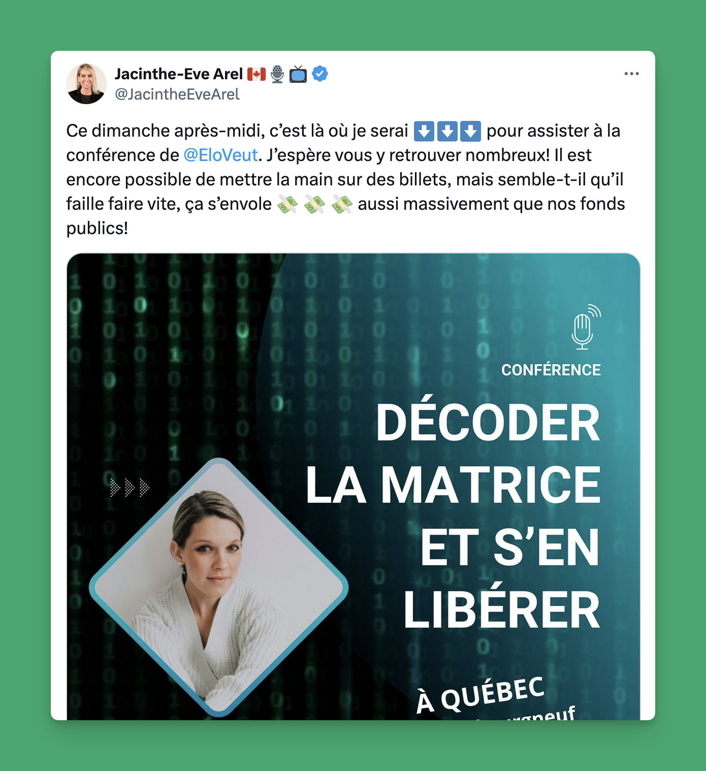 Éloise Boies organise une conférence où elle expliquera comment « décoder la matrice et s’en libérer ». Une conférence dont Jacinthe-Ève Arel fait la promotion.