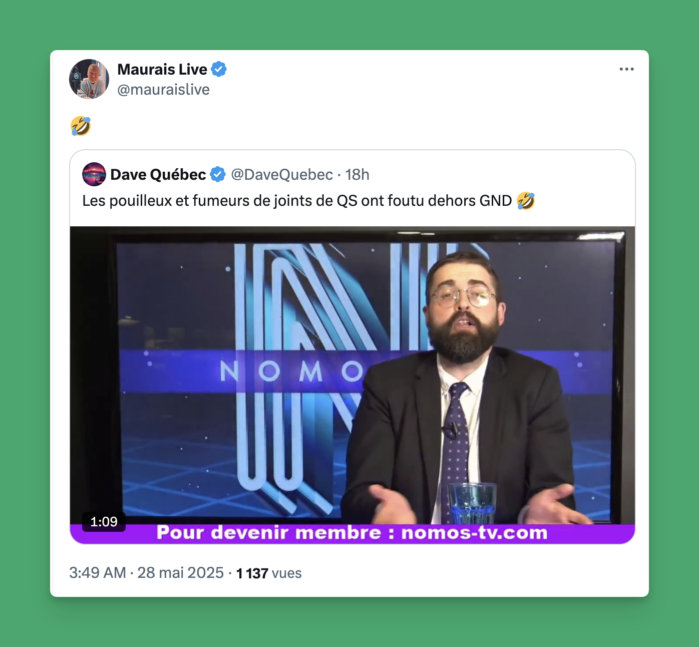 Ça m’a particulièrement frappé dans les dernières semaines alors que j’ai vu Alexandre Cormier-Denis poper à plusieurs reprises dans mon fil. Cormier-Denis, qui se dit ethnonationaliste et dont on avait beaucoup parlé après qu’il avait été invité à participer à une consultation sur l’immigration en 2023 a déjà été associé à Marine Le Pen et a appuyé Éric Zemmour. Jérôme Blanchet-Gravel de Libre média et François Fournier (Frank le Dédômiseur) sont allés discuter avec lui sur sa webtélé et ont relayé leur discussion sur les réseaux sociaux. Rémi Villemure l’a reçu à son balado. Cette semaine, Dominic Maurais a retweeté l’une de ses publications.