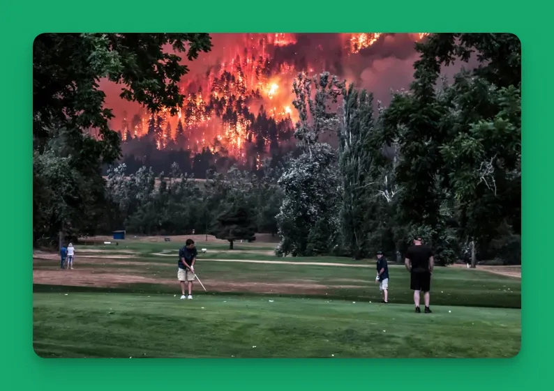 J’étais en train de jouer au golf en banlieue d’une banlieue la semaine dernière et je pensais au monde qui s’écroule autour de nous. Un peu comme dans cette célèbre image d’un homme qui joue au golf pendant que les États-Unis brûlent:
