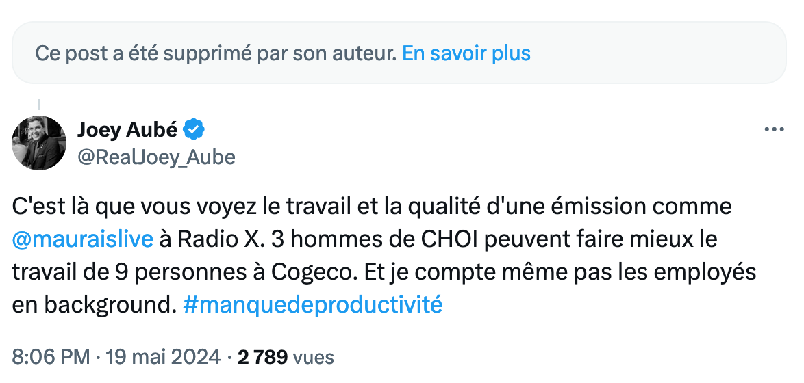 Faut dire que Joey collabore à l’émission de Dominic Maurais. Ça m’a fait rire parce que M. Maurais se vante lui-même de ne pas se préparer. On ne compte plus les fois où il a relayé de fausses informations. Il y a quelques mois, il s’était moqué de Jean-Philippe Cipriani qui à l’émission Tout peut arriver avait perdu l’accès au texte de sa chronique: