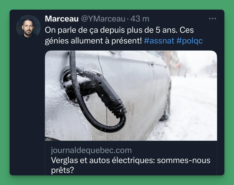 C’est drôle parce qu’il y a deux ans environ, des influenceurs du monde de l’opinion pas vraiment éclairée avaient bien rigolé quand des propriétaires de voitures électriques étaient restés pris à cause de pannes d’électricité liées au verglas.