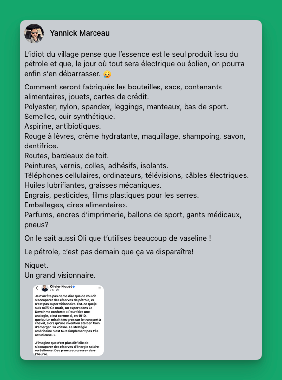 Évidemment, j'avais pas dit que le pétrole allait totalement disparaître. Et les sous-produits du pétrole ne comptent pas pour une énorme proportion, mais il ne faut pas s'attendre à ce que je ce genre de personne soit bonne en statistiques.