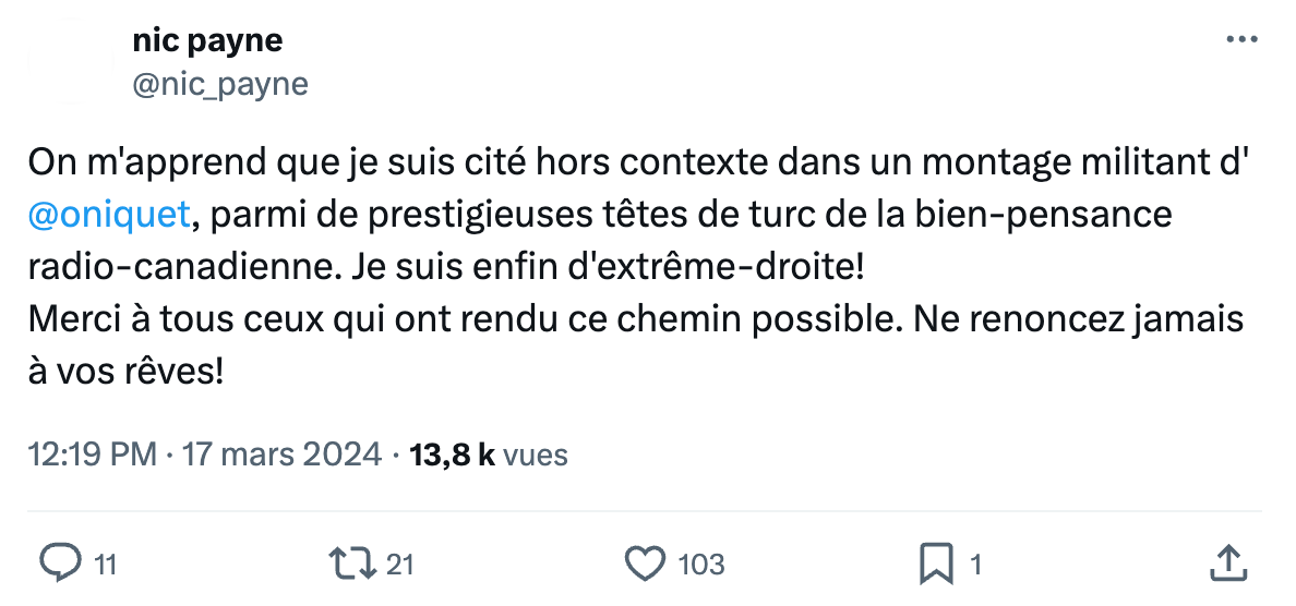 Je n’utilise maintenant X que pour publier des liens vers mes infolettres ou mes vidéos de La journée, mais dans ce cas-ci, je me suis senti dans l’obligation de répondre. Il faut laisser des traces quand des gens diffusent des informations erronées à notre sujet. J’ai donc souligné à M. Payne que je n’avais jamais dit ça. Il m’a répondu: « Quant à l’extrême droite, sans guillemets, on aura compris qu’il ne s’agissait pas d’une citation que je vous attribuais. » Plusieurs personnes sous sa publication, comme sous celle sur Facebook, ont pourtant cru que je l’avais effectivement identifié comme un tenant de l’extrême droite. « On aura compris », mais pas vraiment.
