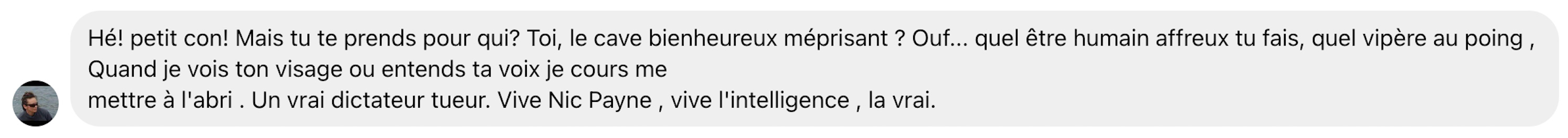 En marge de tout ça, je suis troublé par les commentaires agressifs que j’ai pu lire sous ses publications. On ne répond pas par des arguments, mais par des insultes. Si ce que je publiais suscitait une telle hargne, je me poserais des questions sur mes façons de faire. Lorsque j’en fais mention à M. Payne, il me répond qu’il ne faut pas se fier aux commentaires et que beaucoup de gens ont mis un émoji de petit bonhomme qui rit à sa publication. Voilà qui me rassure.