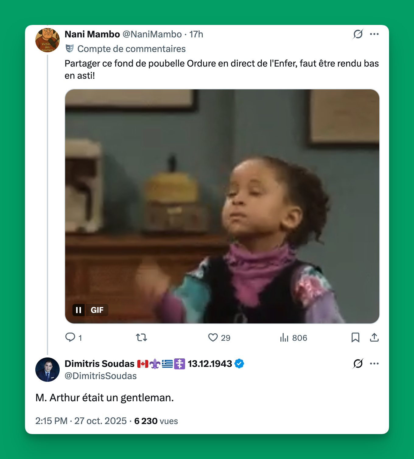 Cette semaine, c’est le compte André Arthur live du paradis que M. Soudas a mis de l’avant. Un compte misogyne (et pas juste ça), mené par un troll agressif qui désinforme. Il n’est pas le premier à lui donner de la visibilité. Mais étrangement, il a pris la peine de le défendre.