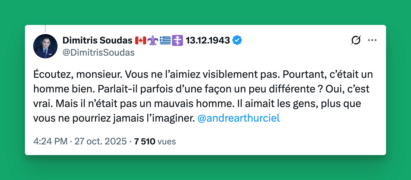 Lorsqu’on regarde Dimitri Soudas à Radio-Canada ou qu’on l’entend à Cogeco, on n’imagine pas que dans un monde parallèle, son jugement ne soit pas particulièrement aiguisé. Le téléspectateur de RDI n’est probablement pas au courant que sur X, M. Soudas est chummé avec Jeff Fillion, vante la « journaliste » de Rebel News et rend hommage à André Arthur. J’ai toujours été fasciné par les gens capables de mener une double vie.